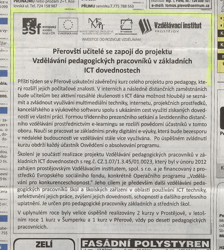 V únoru 2012 zahájil prostějovský Vzdělávací institut, spol. s r.o. realizaci projektu Vzdělávání pedagogických pracovníků v základních ICT dovednostech s reg.č. CZ.1.07/1.3.45/01.0023 financovaný z prostředků Evropského sociálního fondu, konkrétně Operačního programu “Vzdělávání pro konkurenceschopnost”.